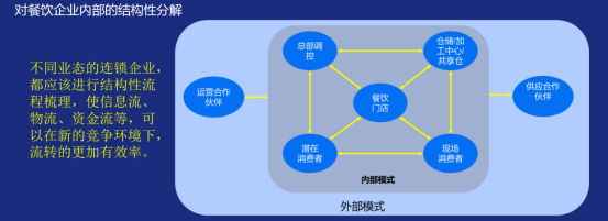分解企業(yè)內(nèi)部結(jié)構(gòu)。經(jīng)營(yíng)餐飲企業(yè)總共加起來,是五個(gè)主體,這五個(gè)主體之間的價(jià)值是什么,相互之間的價(jià)值流又是什么。理順的話,你會(huì)發(fā)現(xiàn)餐飲企業(yè)其實(shí)是以終端為導(dǎo)向的小型的銷售店。