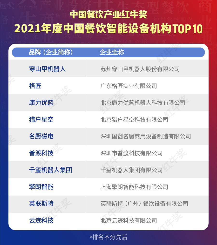 在“2021年度中國餐飲產業(yè)卓越機構”評選中,此次大會特評出“2021年度中國餐飲智能設備機構TOP10”。經過3個多月的層層評選,穿山甲機器人、格匠、康力優(yōu)藍、獵戶星空、名廚磁電、普渡科技、千璽機器人集團、擎朗智能、英聯(lián)斯特、云跡科技獲得“2021年度中國餐飲智能設備機構TOP10”殊榮。