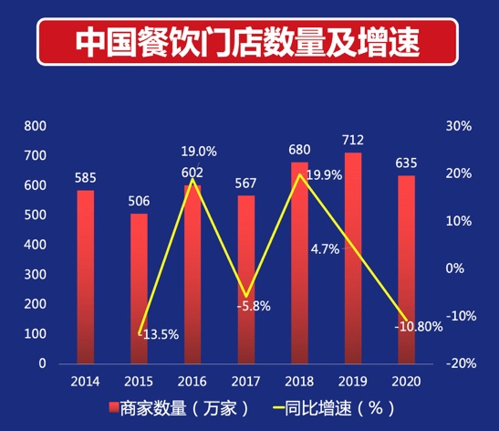 根據(jù)國家統(tǒng)計(jì)局發(fā)布數(shù)據(jù)顯示,2020年全國餐飲總收入為39527億元,同比下降16.6%。同時(shí),2020年全國餐飲門店總數(shù)也有所下降,估計(jì)從約712萬降至約635萬。