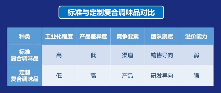 在調(diào)味品行業(yè)競爭格局相對成型的情況下,定制復(fù)合調(diào)味品處于高增紅利期,近期表現(xiàn)出色,有望成為行業(yè)爆發(fā)點(diǎn)。定制復(fù)合調(diào)味品企業(yè)可以通過差異化產(chǎn)品、差異化客戶迅速搶占市場,在產(chǎn)品力和渠道力上同時(shí)突破。