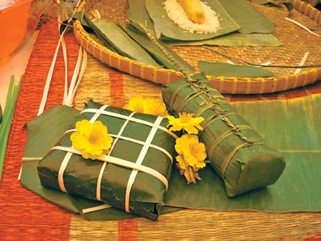 越南的粽子是用芭蕉葉包裹的,有圓形和方形兩種,取天圓地方(越南語:Thiên Viên a ph ng)之意。他們認(rèn)為,圓形粽子代表天,方形粽子代表地,天地合一,大吉大利。越南粽子包有糯米、綠豆、豬肉和胡椒粉,味道十分獨特;粽子的外形呈四方,另外使用橫豎兩根竹篾扎起來,外形像田地,代表新年五谷豐登的意思,而豬肉則表示出入興旺。