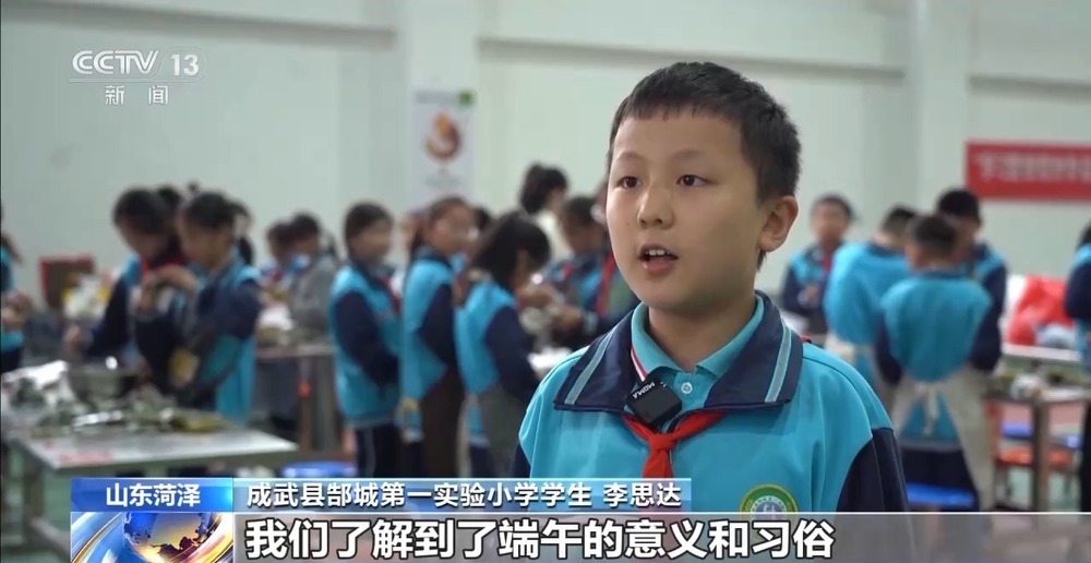 在成武縣郜城第一實驗小學的食堂里,學生們圍坐在一起,在老師的指導下,折粽葉、填餡料、壓實、捆扎。師生們一邊包粽子,一邊分享著端午節(jié)的習俗和故事。