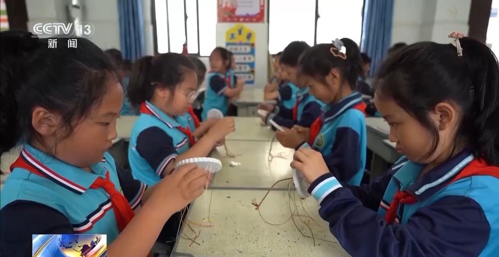 隨后,學生們開始編織五彩繩,從穿引固定絲線到反復纏繞打結,有的同學還發(fā)揮創(chuàng)意將鈴鐺、小粽子掛件編入其中,創(chuàng)作出色彩艷麗、寓意吉祥的作品。