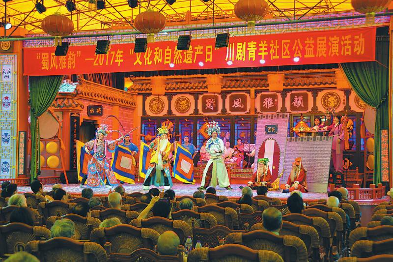 6月6日上午,成都市文化公園傳來陣陣鑼鼓聲,由省藝術(shù)研究院主辦的“蜀風(fēng)雅韻”——2017年“文化和自然遺產(chǎn)日”川劇青羊社區(qū)公益展演活動在此舉行,吸引了百余名市民觀看。