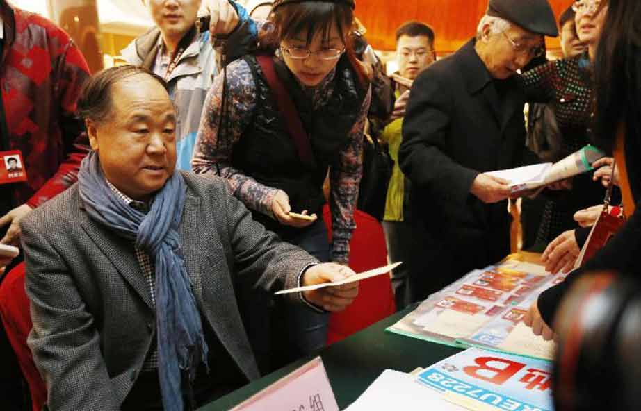 3月2日,出席全國政協(xié)十二屆二次會議的全國政協(xié)委員莫言在北京國際飯店報到。