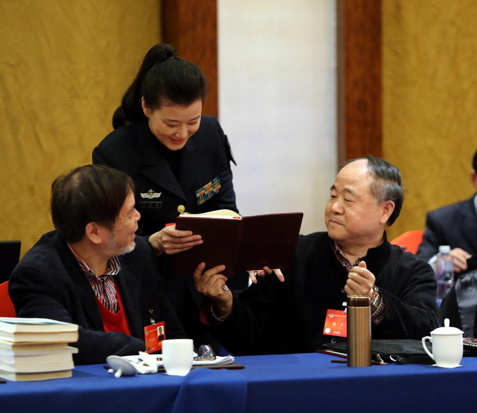 03月06日,全國政協(xié)十二屆二次會議文藝界別委員小組討論會。宋祖英利用會議間隙,將一本畫冊遞給莫言,請求簽名。