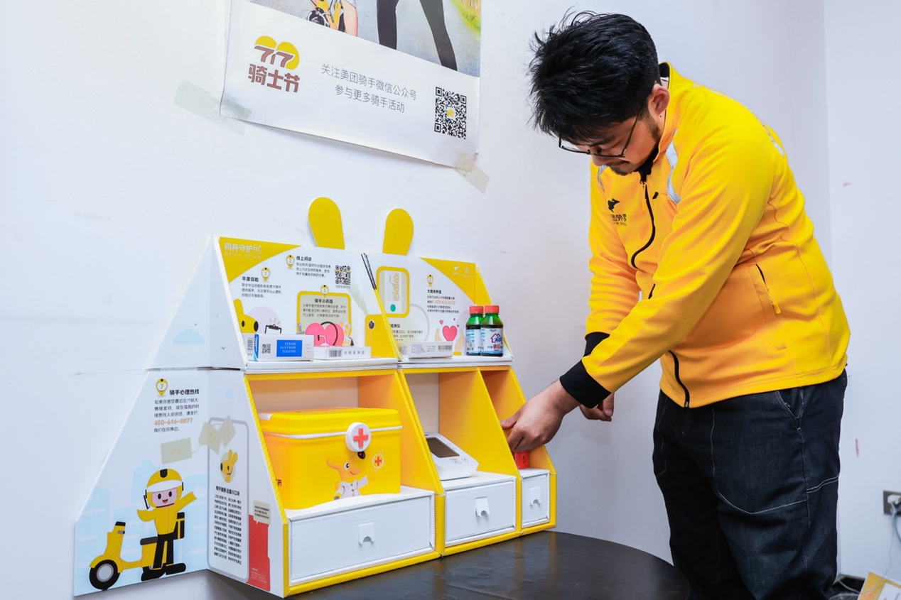今年717騎士節(jié)期間,美團外賣將為全國配送站點配置超過五千臺集藥品放置、醫(yī)療器械、科普宣導、服務指引、意見反饋為一體的“同舟守護1㎡”,其中包含的小藥箱隨季節(jié)每年更新四次藥品,為騎手提供符合當季需要的藥品。值得一提的是,“同舟守護1㎡”將向全行業(yè)外賣騎手、配送員、環(huán)衛(wèi)工人開放,在大家需要常用藥品、急救藥物、防暑降溫物資時,都可以尋找美團外賣配送站點,向站長尋求幫助。