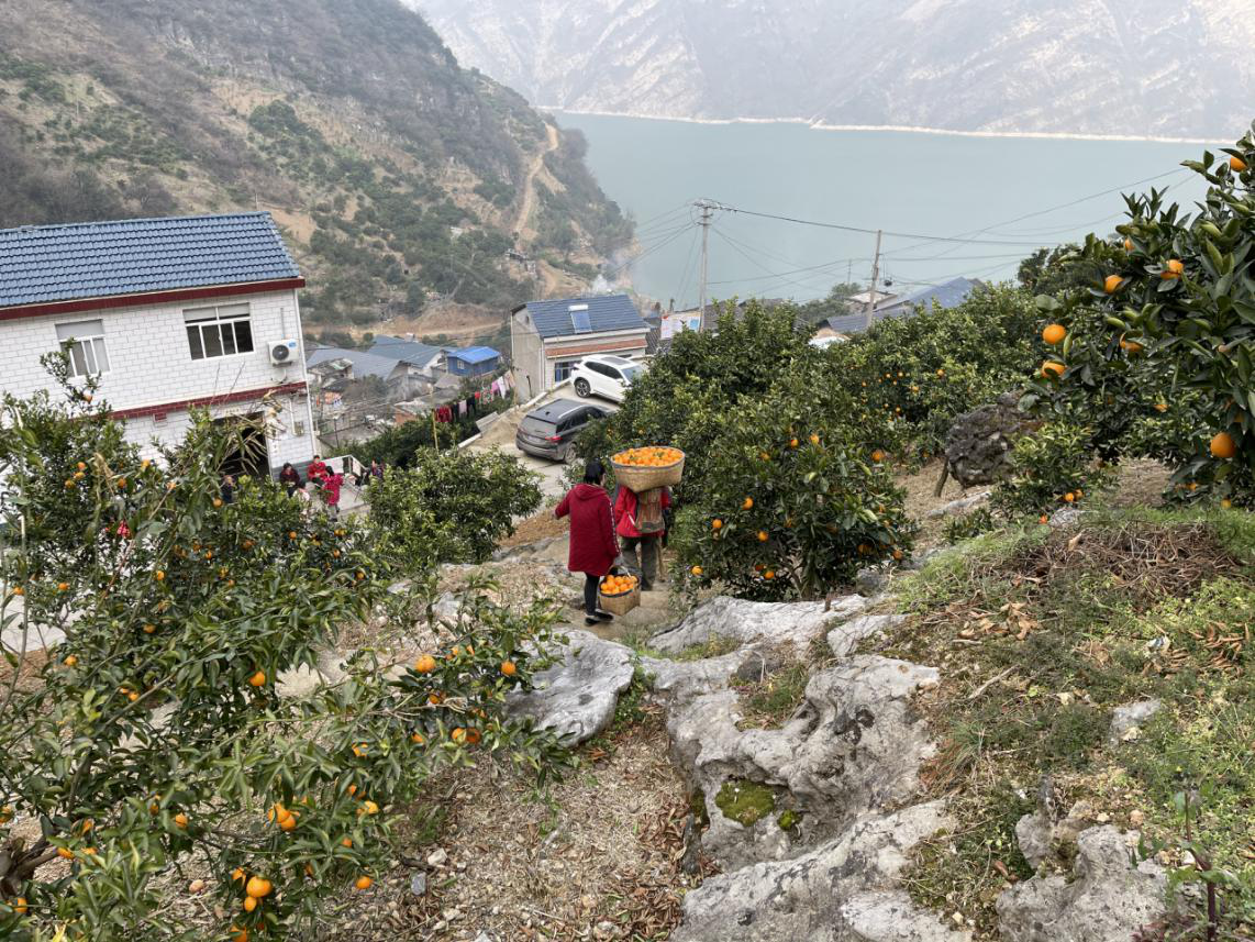 船行至秭歸縣屈原鎮(zhèn)鏈子巖村,峰巒高聳、夾江壁立的西陵峽更顯奇峻。抬頭遠(yuǎn)望,百丈懸崖上有鐵鏈相系,鐵鏈下,連片的梯田倚江而立,梯田中,金燦燦的臍橙壓彎樹梢,秀美的田園風(fēng)光讓人心曠神怡。