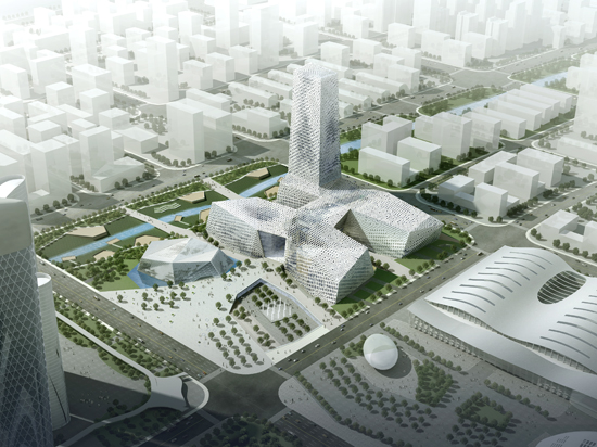 在省會(huì)文化藝術(shù)中心整體建設(shè)中,與大劇院相得益彰的是威海路北側(cè)的“三館”。不同于以“半球”形為主的大劇院,“三館”更有棱角。站在大劇院配套高層上俯瞰,大劇院既像溫潤(rùn)的貝殼,又像晶瑩的水滴,而“三館”的俯視圖則更像閃耀的星星。