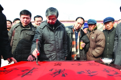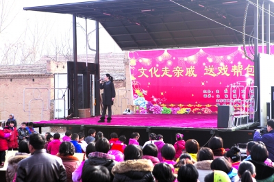 1月24日,山東省文化廳組織文化下鄉(xiāng)團隊赴菏澤市鄆城縣黃集鄉(xiāng)5個“第一書記”幫包村,舉辦了“文化走親戚送戲幫包村”活動。山東省呂劇院、山東省柳子劇團等山東省直文藝單位的百余位藝術(shù)家為當(dāng)?shù)厝罕娝蜕狭司实奈乃囇莩觯?0多位山東省知名書法家為村民們現(xiàn)場書寫春聯(lián)300余副。記者在活動現(xiàn)場看到,村里的計劃生育室被臨時改成了演員化裝室,為抵御嚴(yán)寒,化完裝的演員們就在屋里來回走動。近百平方米的屋子里,一個“小太陽”取暖器是唯一的取暖設(shè)備。
