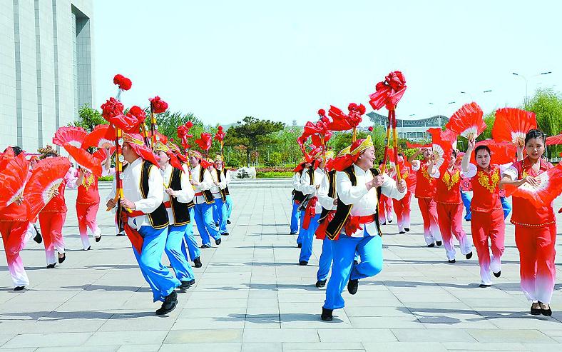 4月25日,出演民間廣場(chǎng)舞《花鼓鑼子》的演員正在市藝術(shù)館廣場(chǎng)上進(jìn)行排練表演。