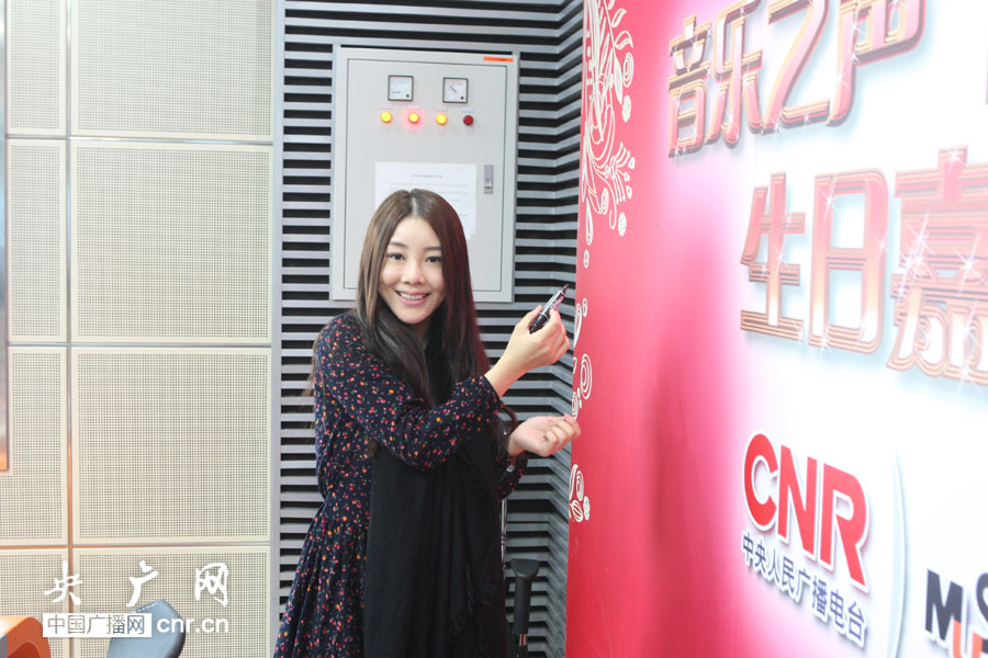 王箏在音樂之聲十一周年生日嘉年華背板上簽名(央廣網(wǎng)記者陳江南_攝)
