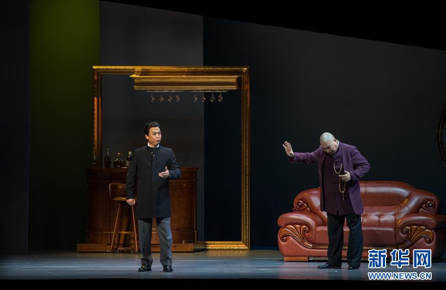 6月1日,演員在現(xiàn)代京劇《在路上》中表演。當(dāng)日,反腐題材現(xiàn)代京劇《在路上》湖北巡演首場演出在武漢洪山禮堂舉行。 新華社發(fā)(熊琦攝)