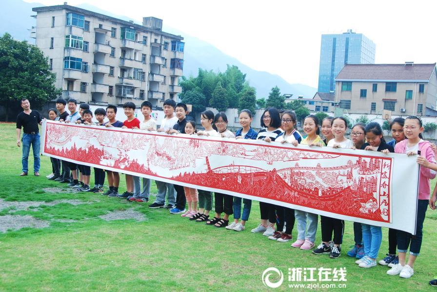 6月6日,浙江省建德市乾潭初級中學的兩位青年教師蔣海平、周道泉共同創(chuàng)作完成的巨幅剪紙作品《新富春山居圖》在校園里一經展出,就受到了師生們的熱烈追捧。據(jù)了解,他們自2016年初開始,就根據(jù)建德綠道中的人文、地理、古建筑、名勝古跡等環(huán)境元素,參照《富春山居圖》的創(chuàng)作思路,利用業(yè)余時間精心設計、反復修改,前后用了一年半時間,創(chuàng)作出這幅長8.5米,寬0.8米的巨幅剪紙作品。 圖片來源:浙江在線