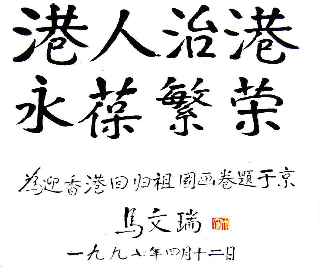 全國政協(xié)原副主席馬文瑞為“迎香港回歸-首都百名老人書畫百米長卷展”題字