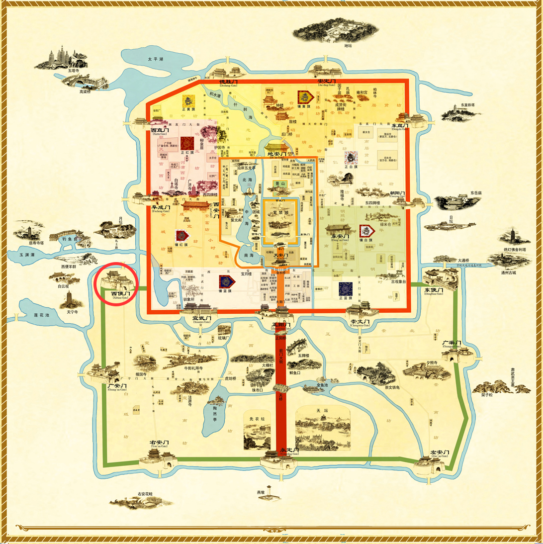 西便門(mén)有“西便白羊”一景。原來(lái)在外護(hù)城河左岸的草地中,散落著白石數(shù)十塊,形狀不一,長(zhǎng)約三四尺,遠(yuǎn)遠(yuǎn)望去,就跟綠草中的白色羊群一樣,悠閑地啃食青草。最有代表性的傳說(shuō)是:魯班爺用法術(shù)把石頭變成白羊,趕來(lái)?yè)屝薇本┏,由于延誤了時(shí)辰,未被用上,白羊又變回了石頭。因西便門(mén)附近確實(shí)曾經(jīng)是羊群出沒(méi)之地。北京人偏愛(ài)羊肉,有需求就有供應(yīng),極大地刺激了北京羊業(yè)的發(fā)展。活羊交易場(chǎng)所﹣羊店、羊肉鋪(也稱(chēng)“羊肉床子”)、羊肉館應(yīng)運(yùn)而生。