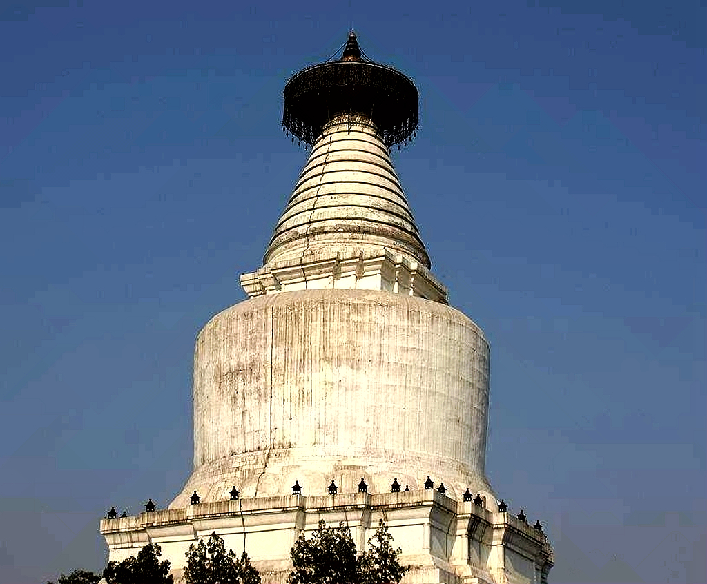 白塔為藏式佛塔,磚石結(jié)構(gòu),由尼泊爾人阿尼哥設(shè)計(jì)建造。阿尼哥擅長(zhǎng)鑄造佛像,初隨本國(guó)匠人去西藏監(jiān)造黃金塔,后入元大都。他除了造北京白塔寺外,還造了五臺(tái)山大塔院白塔。妙應(yīng)寺白塔磚砌,外抹白堊,總高約15丈。白塔比例勻稱,狀如覆缽,其制如蓋,通體雪白。如同一個(gè)巨大的寶葫蘆矗立在密集的北京民居之間。塔的外觀由塔基、塔身、相輪、傘蓋、寶瓶等組成。