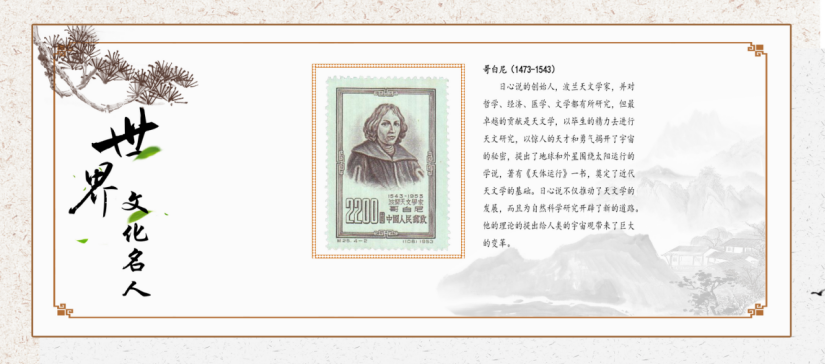 1953年,世界和平理事會提出紀念世界四位文化名人:中國詩人屈原、波蘭天文學家哥白尼、法國作家拉伯雷、古巴作家馬蒂。1953年12月30日,為了介紹世界四位文化名人,配合這次紀念活動,中華人民共和國郵電部發(fā)行了《世界文化名人》紀念郵票,全套4枚由孫傳哲先生設計,孔紹惠先生、唐霖坤先生雕刻,北京人民印刷廠營業(yè)分廠印制。