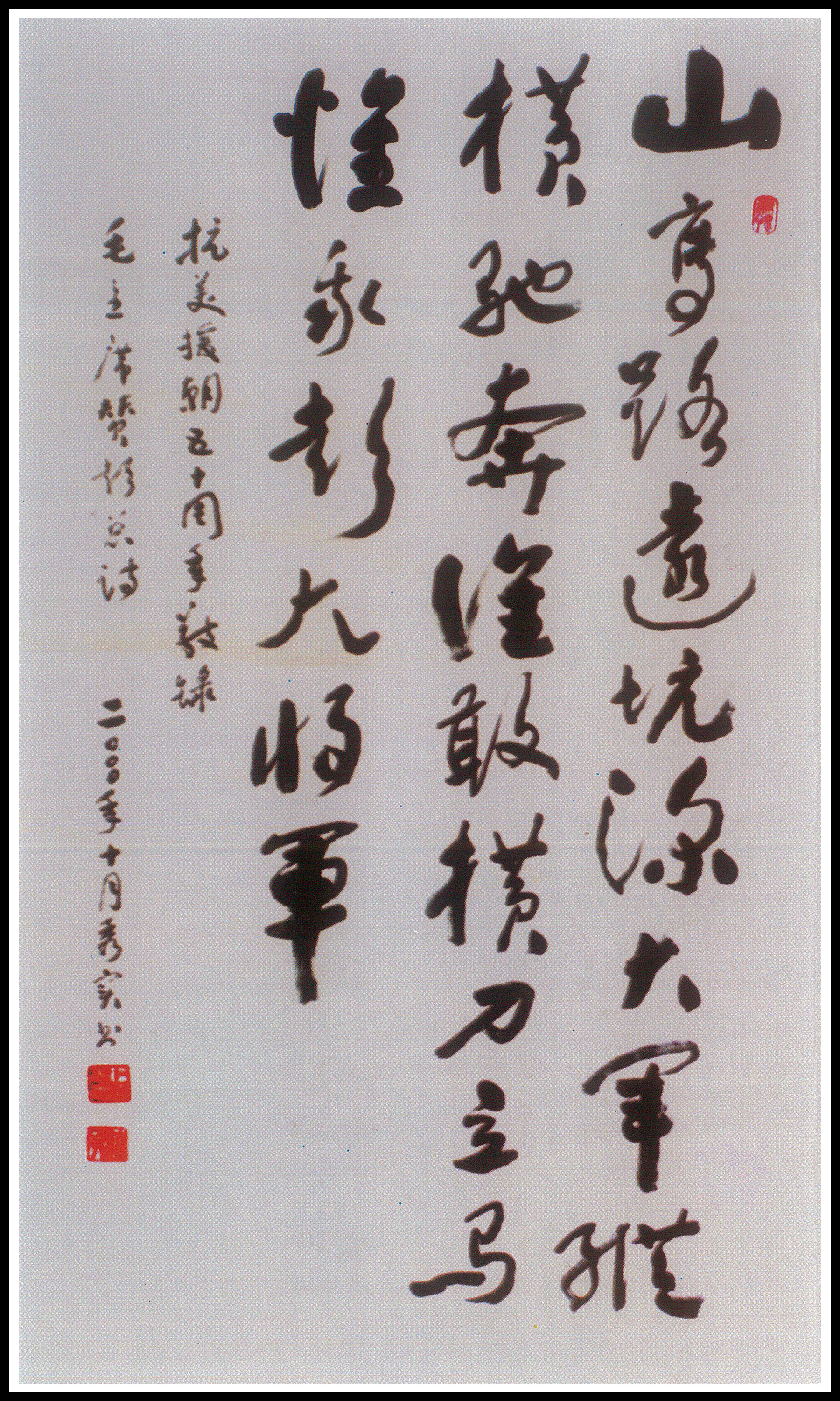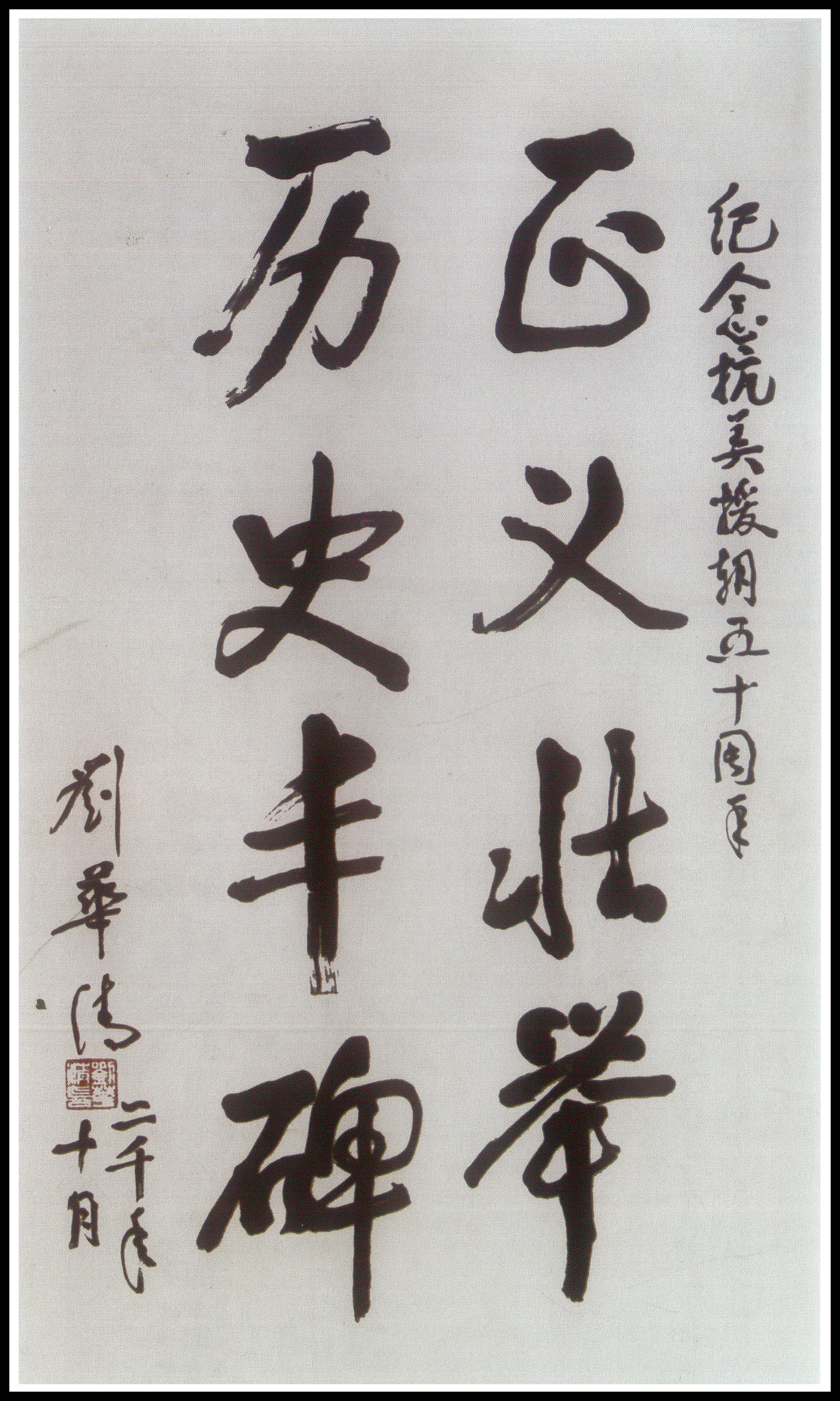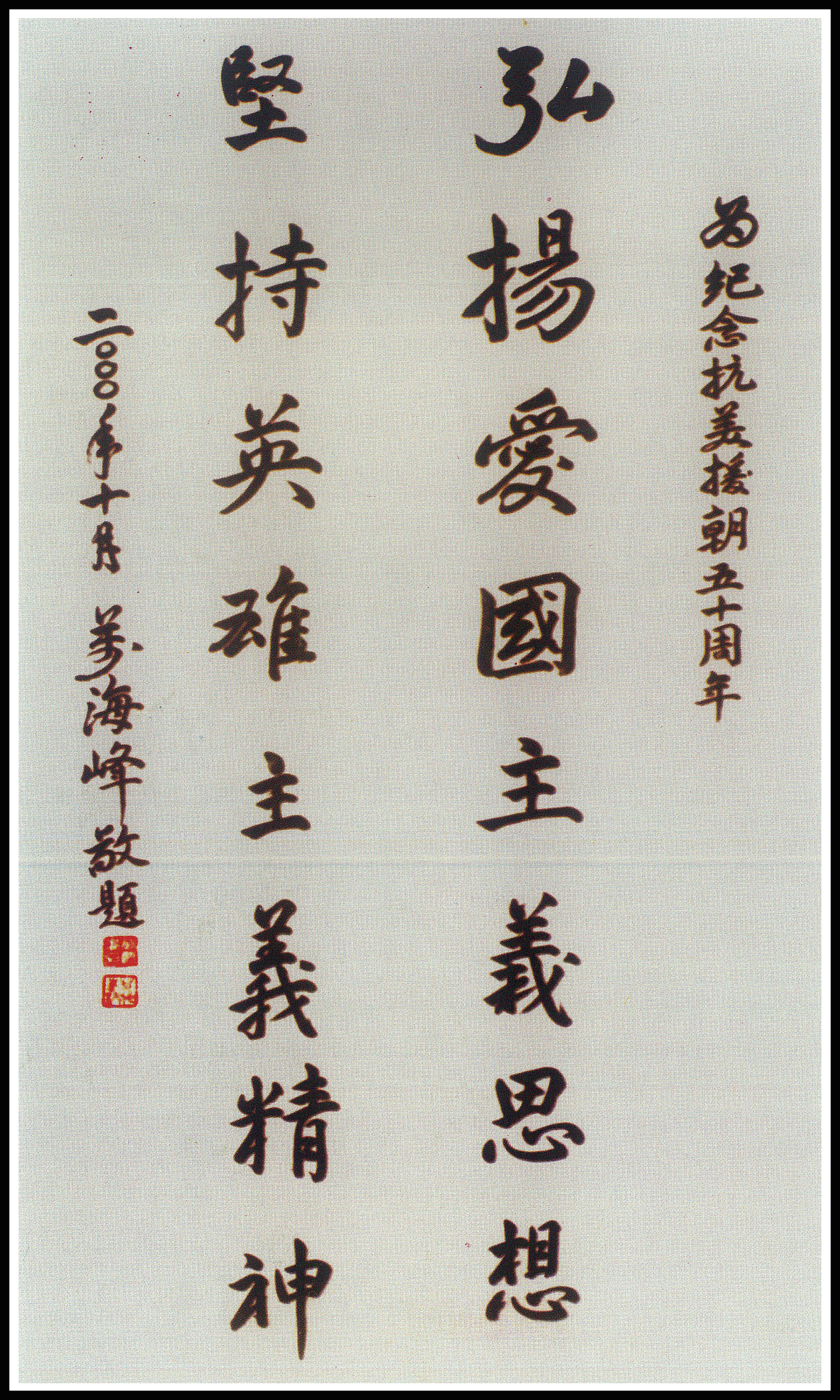 2000年12月12日至17日,北京大運(yùn)河翰林文化開(kāi)發(fā)中心在北京中國(guó)人民革命軍事博物館隆重舉辦《紀(jì)念中國(guó)人民志愿軍抗美援朝出國(guó)作戰(zhàn)五十周年書(shū)畫(huà)大展》,目的是要弘揚(yáng)志愿軍的愛(ài)國(guó)主義、革命英雄主義、無(wú)私奉獻(xiàn)和國(guó)際主義精神,通過(guò)緬懷先烈們戰(zhàn)爭(zhēng)中所呈現(xiàn)的各族人民不畏強(qiáng)暴、維護(hù)和平的決心和不可戰(zhàn)勝的力量,充分體現(xiàn)中華兒女愛(ài)國(guó)主義、國(guó)際主義和革命英雄主義的浩然正氣,讓中國(guó)得到世界人民的尊敬。畫(huà)展由中國(guó)老年書(shū)畫(huà)研究會(huì)、中國(guó)人民革命軍事博物館、北京大運(yùn)河翰林文化開(kāi)發(fā)中心共同舉辦。