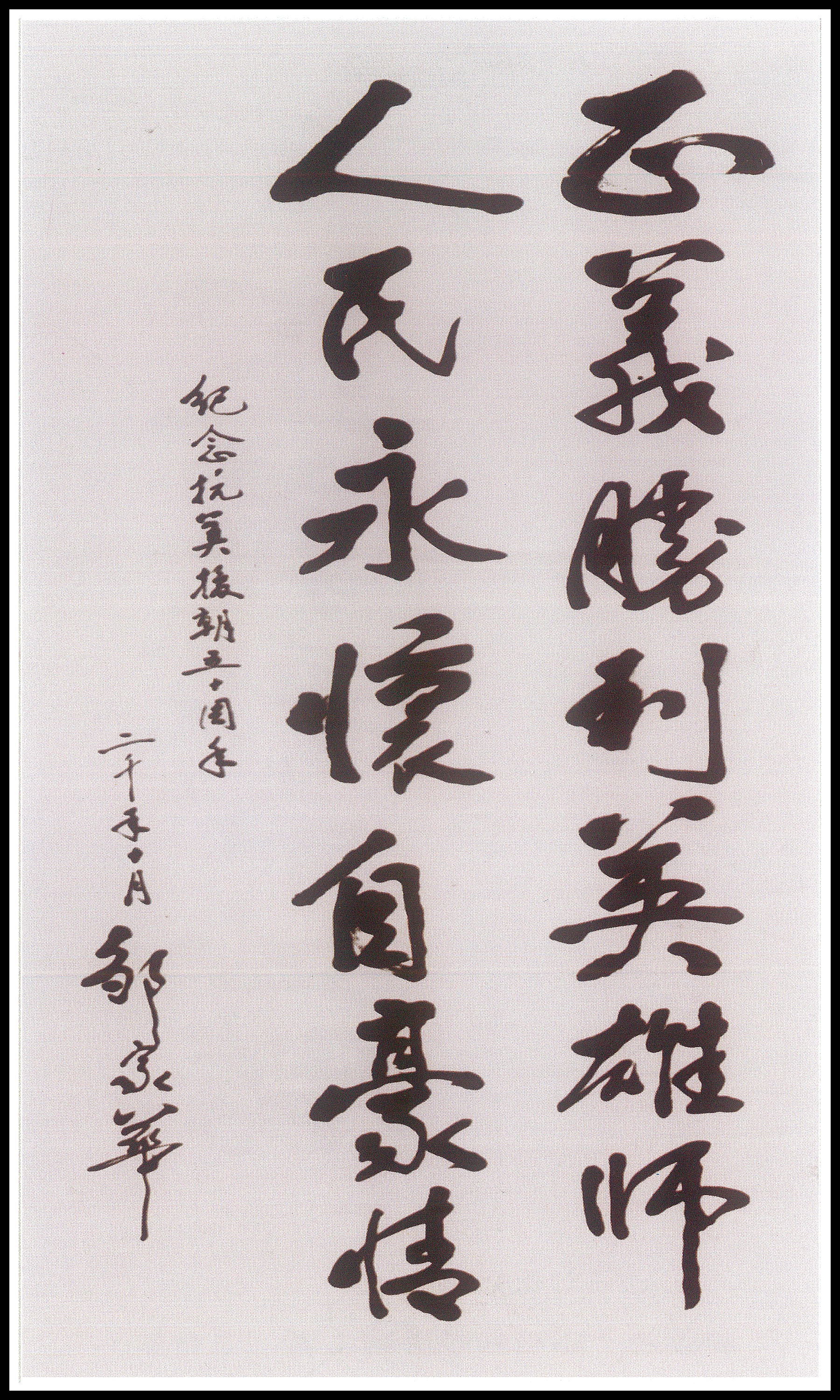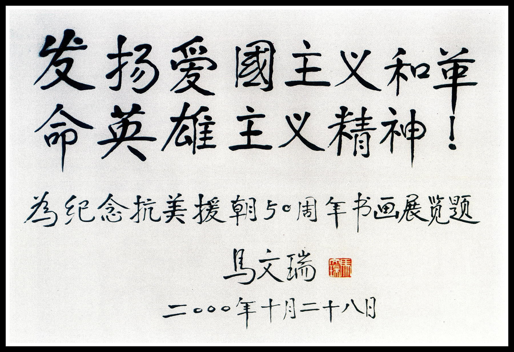 2000年12月12日至17日,北京大運(yùn)河翰林文化開(kāi)發(fā)中心在北京中國(guó)人民革命軍事博物館隆重舉辦《紀(jì)念中國(guó)人民志愿軍抗美援朝出國(guó)作戰(zhàn)五十周年書(shū)畫(huà)大展》,目的是要弘揚(yáng)志愿軍的愛(ài)國(guó)主義、革命英雄主義、無(wú)私奉獻(xiàn)和國(guó)際主義精神,通過(guò)緬懷先烈們戰(zhàn)爭(zhēng)中所呈現(xiàn)的各族人民不畏強(qiáng)暴、維護(hù)和平的決心和不可戰(zhàn)勝的力量,充分體現(xiàn)中華兒女愛(ài)國(guó)主義、國(guó)際主義和革命英雄主義的浩然正氣,讓中國(guó)得到世界人民的尊敬。畫(huà)展由中國(guó)老年書(shū)畫(huà)研究會(huì)、中國(guó)人民革命軍事博物館、北京大運(yùn)河翰林文化開(kāi)發(fā)中心共同舉辦。