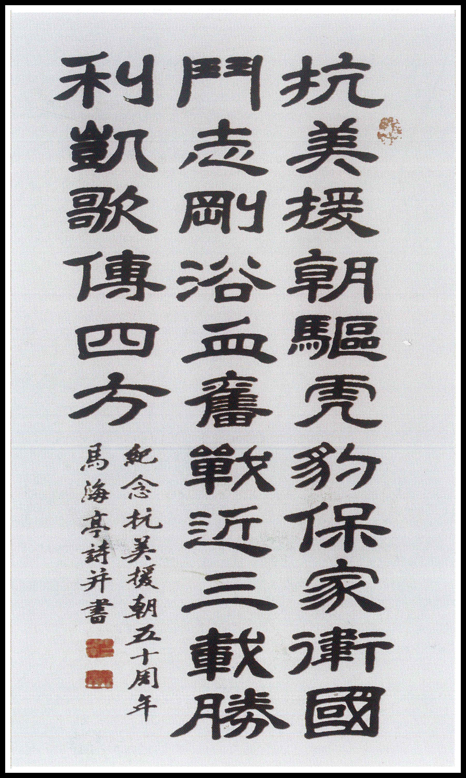 2000年12月12日至17日,北京大運河翰林文化開發(fā)中心在北京中國人民革命軍事博物館隆重舉辦《紀念中國人民志愿軍抗美援朝出國作戰(zhàn)五十周年書畫大展》,目的是要弘揚志愿軍的愛國主義、革命英雄主義、無私奉獻和國際主義精神,通過緬懷先烈們戰(zhàn)爭中所呈現(xiàn)的各族人民不畏強暴、維護和平的決心和不可戰(zhàn)勝的力量,充分體現(xiàn)中華兒女愛國主義、國際主義和革命英雄主義的浩然正氣,讓中國得到世界人民的尊敬。畫展由中國老年書畫研究會、中國人民革命軍事博物館、北京大運河翰林文化開發(fā)中心共同舉辦。