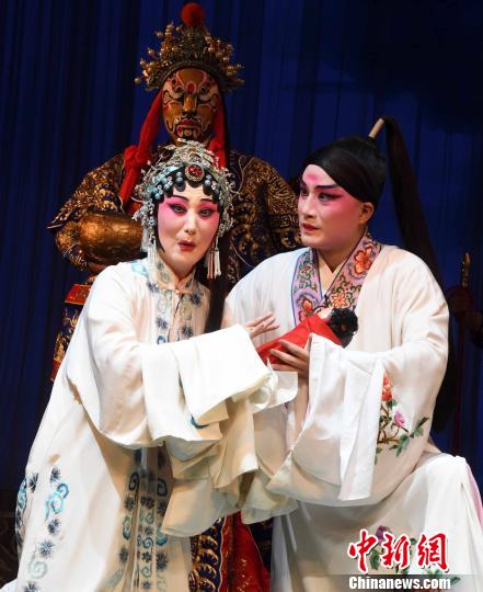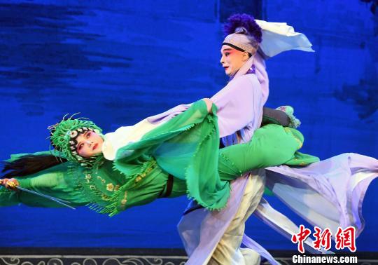 福建京劇院國(guó)家一級(jí)演員、中國(guó)戲劇梅花獎(jiǎng)得主孫勁梅(左一)在京劇《白蛇傳·合缽》中飾演白素貞!⒖筛z