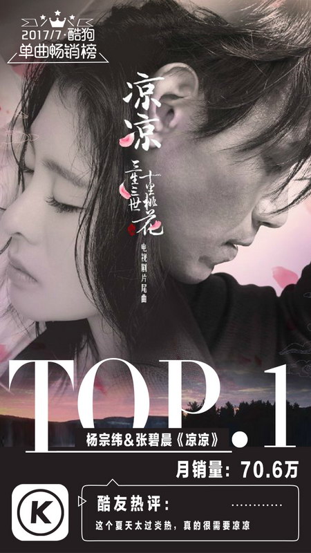 因?yàn)橐徊縿,捧紅一首歌,說(shuō)的就是楊宗緯、張碧晨演唱的《涼涼》。即便電視劇《三生三世十里桃花》已落幕許久,這首歌依舊存在于大眾的單曲循環(huán)庫(kù)中。