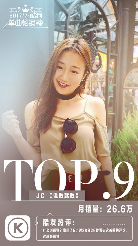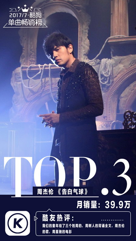 又到了酷狗單曲暢銷榜揭榜時(shí)刻!7月,李榮浩《李白》、陳奕迅《十年》、JC《說(shuō)散就散》實(shí)力上榜,楊宗緯&張碧晨《涼涼》再度奪冠,莊心妍《走著走著就散了》、周杰倫《告白氣球》穩(wěn)居前三。那么,本月十大暢銷金曲還有哪幾首,立即為你們揭曉。