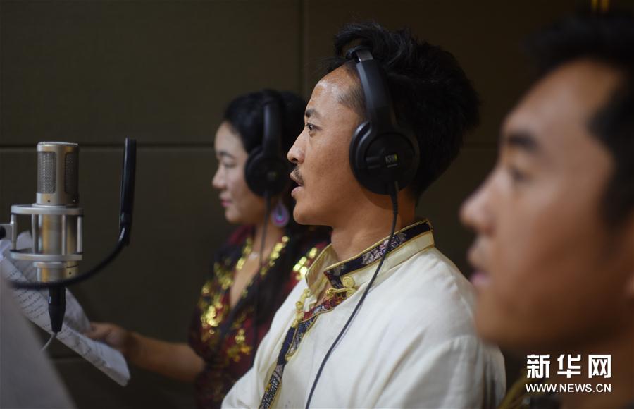 8月31日,青海省民族語影視譯制中心配音演員仁青卡(中)在錄音棚內(nèi)為電視劇配音。新華社記者張宏祥攝