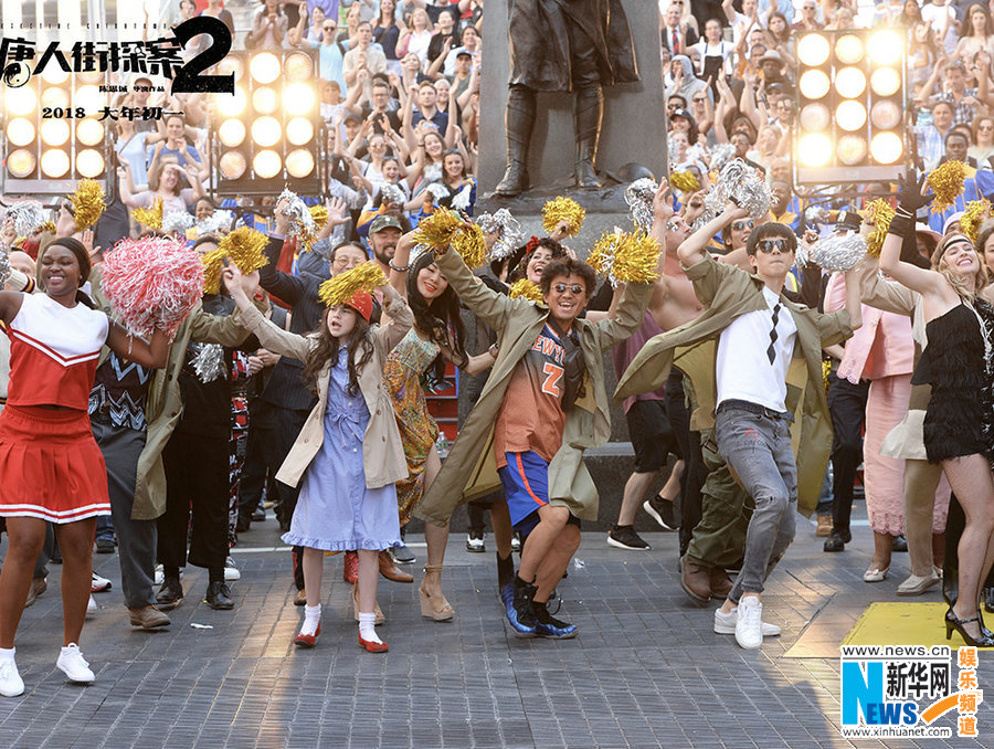 劇組成員活潑搞怪的舞蹈十分具有感染力,F(xiàn)場,觀眾們自發(fā)cosplay成西部牛仔、福爾摩斯等典型的偵探形象參與到這場狂歡中,上百位百老匯演員、唱詩班成員等西方文化代表樂在其中,另有數(shù)百位粉絲熱情參與拍攝,千人一起擺手、扭胯、邁步,場面十分震撼。作為第一部在時(shí)代廣場進(jìn)行大規(guī)模拍攝的中國電影,《唐探2》“廣場舞style”可謂嗨翻紐約,中西文化的強(qiáng)烈碰撞也持續(xù)引爆了全球“糖水”對于影片的關(guān)注,更彰顯出《唐探》系列電影的喜劇魅力。