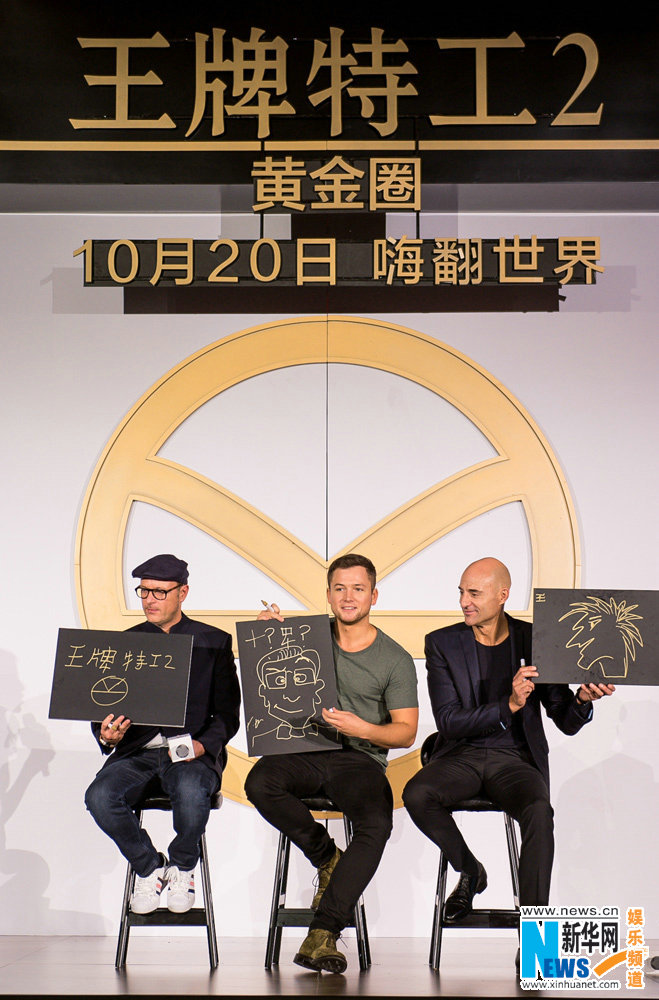此次《王牌特工2:黃金圈》的中國(guó)行可謂亮點(diǎn)頗多,可以說(shuō)從一落地就開(kāi)始“瘋狂撩粉“。先是蛋蛋與馬強(qiáng)的機(jī)場(chǎng)照走紅網(wǎng)絡(luò),身穿短褲、拖鞋的隨性蛋蛋和”腿長(zhǎng)兩米八“的馬強(qiáng)畫風(fēng)迥異,反差萌瞬間圈粉。之后,兩人又接受了霸氣十足的”黃金蟹“宴席款待,幾十只大閘蟹拼出影片logo吸睛十足,兩人還有模有樣的學(xué)起如何使用蟹八件,入鄉(xiāng)隨俗的程度可謂驚人。最大的亮點(diǎn)來(lái)自發(fā)布會(huì),粉絲精心準(zhǔn)備的二次元畫作令主創(chuàng)大開(kāi)眼界,既有集中國(guó)傳統(tǒng)古風(fēng)于一身的“特工奔月圖”讓人眼前一亮,也有“王牌鐵三角”黃金周中國(guó)游Q版組圖萌翻全場(chǎng),眾多電影主角畫風(fēng)多變打破次元壁,引得主創(chuàng)紛紛稱贊。欣賞過(guò)粉絲畫作后,主創(chuàng)也即興上手搞起創(chuàng)作來(lái),導(dǎo)演馬修·沃恩完美挑戰(zhàn)漢字默寫,“王牌特工2”5個(gè)漢字極其工整,引發(fā)觀眾驚呼,而蛋蛋與馬強(qiáng)則調(diào)皮十足,現(xiàn)場(chǎng)飛速創(chuàng)作,尤其是蛋蛋的自畫像博得一片喝彩,將氣氛引向高潮。最后,三位還獲贈(zèng)了中國(guó)古代“著名特工”——錦衣衛(wèi)的令牌作為比拼獎(jiǎng)勵(lì),三位對(duì)禮物愛(ài)不釋手,并大擺錦衣衛(wèi)pose,古今中外的特工范兒相映成趣。最后主創(chuàng)齊邀觀眾10月20日走進(jìn)影院,解鎖這場(chǎng)嗨翻世界的精彩!