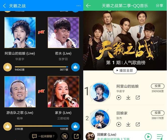 不過(guò),民間歌手們的實(shí)力太過(guò)超群,竟讓莫文蔚和張杰接連落敗。不過(guò),好在華晨宇和楊坤頂住壓力分別借助一曲《阿里山的姑娘》和《游擊隊(duì)之歌》得到觀眾的青睞,扳回一城。華晨宇親自參與編曲,將一首《阿里山的姑娘》融入了鋼琴、搖滾、說(shuō)唱等多元化音樂(lè)元素,蕩氣回腸的演唱也讓他成功守住了塔頂,而節(jié)目之外,在酷狗音樂(lè)本期素人PK明星歌曲列表中,華晨宇獲得了9萬(wàn)多票的支持,領(lǐng)先張夢(mèng)羽的3000多票,更是毫無(wú)懸念的以39萬(wàn)的超高票數(shù)登上了QQ音樂(lè)天籟之戰(zhàn)第1期人氣歌曲榜榜首的位置。華晨宇的才華再次在節(jié)目中得到展現(xiàn),更在QQ音樂(lè)、酷狗音樂(lè)、酷我音樂(lè)平臺(tái)得到了進(jìn)一步的人氣佐證。