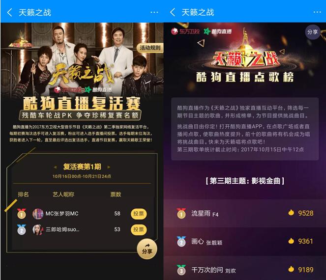 當(dāng)然,在PK中落敗的民間歌者張夢(mèng)羽和三郎哈姆,仍有重返天籟之戰(zhàn)的機(jī)會(huì),在酷狗音樂(lè)的復(fù)活賽專(zhuān)區(qū),助力挑戰(zhàn)者重返舞臺(tái)的投票也已悄然展開(kāi)。