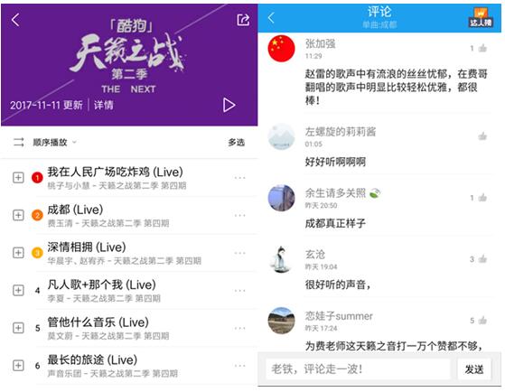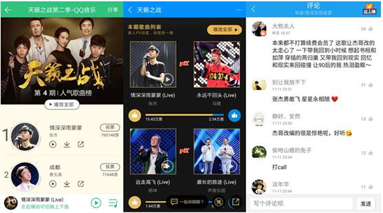 11月11日晚,大型星素勵(lì)志音樂節(jié)目《天籟之戰(zhàn)2》第四期播出,改檔周六好戲提前,但比拼仍然激烈:“天籟唱將”莫文蔚、費(fèi)玉清、楊坤、張杰再度集結(jié),迎戰(zhàn)民間歌者,華晨宇則在本期休戰(zhàn)。作為《天籟之戰(zhàn)2》專享音頻合作方及互動(dòng)平臺(tái),騰訊音樂娛樂集團(tuán)旗下三大平臺(tái)QQ音樂、酷狗音樂、酷我音樂也如約同步上線節(jié)目音頻,吸引了大批網(wǎng)友前來為喜愛的歌曲打榜。