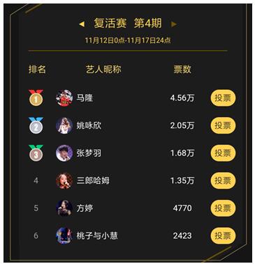 “三連勝”的楊坤也迎來了二樓選手的挑戰(zhàn)——實(shí)力強(qiáng)勁的彭鵬和小文使用優(yōu)先選擇權(quán)與楊坤展開PK。楊坤本輪挑戰(zhàn)歌曲是昔日學(xué)員金志文剛發(fā)行的《遠(yuǎn)走高飛》,個(gè)性化的演繹被QQ音樂網(wǎng)友大贊“很有坤哥的味道”,最終以本季開播以來最高的330票險(xiǎn)勝。