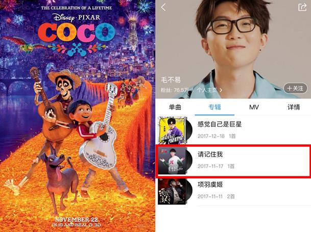 到目前為止,已有50余部中外影片加入賀歲檔,賀歲檔的群雄逐鹿,讓各個宣發(fā)渠道成為各家爭奪的戰(zhàn)場,此前,迪士尼皮克斯動畫《尋夢環(huán)游記》靠著高口碑在上周依然獲得市場力挺,累計票房已經(jīng)突破10億。好看的電影背后,自然少不了好聽的音樂。由毛不易演唱的中文主題曲《請記住我》,登陸酷狗音樂以來,歌曲評論突破999+,影片未上映之前就收獲了來自酷狗音樂大量用戶的好評。