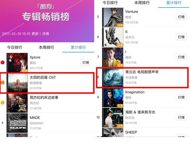 隨著電影市場的逐年火爆,影視OST也逐漸得到重視,據(jù)《2017中國音樂產(chǎn)業(yè)發(fā)展報告》顯示,2016年,國內(nèi)影視劇音樂產(chǎn)業(yè)總值約為3.94億元,同比增長34%。面對巨大的音樂市場,影視+音樂在數(shù)字音樂平臺的表現(xiàn)也相當(dāng)生猛,此前《三生三世十里桃花》的主題曲《涼涼》以596萬單曲銷量排名《酷狗單曲暢銷榜單》第二名,《太陽的后裔》《青云志》以超高的專輯銷量金額位列《酷狗專輯暢銷》榜第二名、第八名。