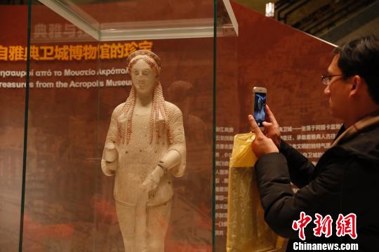 中新網(wǎng)上海1月10日電 (王笈)展覽“典雅與狂歡:來自雅典衛(wèi)城博物館的珍寶”10日晚在上海博物館開幕。來自希臘雅典衛(wèi)城博物館的兩件藏品——科拉雕像和舞樂圖瓶畫器蓋亮相上海博物館大堂,在此迎接中外來客。