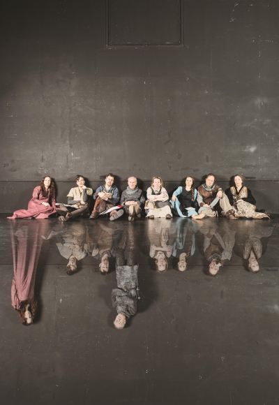 《木板上的畫》來源于中世紀(jì)祭壇畫面,描繪了各種各樣的人物:騎士、鄉(xiāng)紳、孕婦、女巫、年輕女孩、小丑、鐵匠和他的妻子。一個(gè)身著黑衣的青年彈奏魯特琴,講述著瘟疫的可怕故事。在幕布升起前,通過向觀眾展示人物剪影,祭壇畫面得以在劇院中重現(xiàn),角色以各種富有表現(xiàn)力的姿勢凝固。該劇是關(guān)于他們怎樣試圖避免瘟疫的,然而最終他們都在一個(gè)骷髏的命令下,跳著舞進(jìn)了地獄;而骷髏正是死亡的象征。