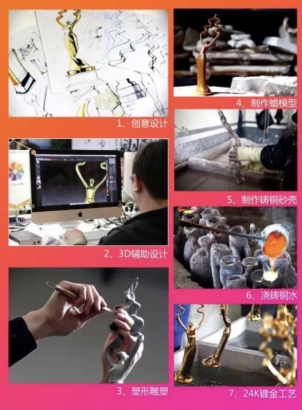 而在設計環(huán)節(jié),組委會專門邀請了清華大學美術學院設計專家坐鎮(zhèn)現(xiàn)場,從天壇的建筑造型到人物造型再到電影主題,親自指導多位設計師進行創(chuàng)作。經過反復的推敲和打磨,歷時五個多月,出了60多份設計稿,終于確定了獎杯的設計方案。