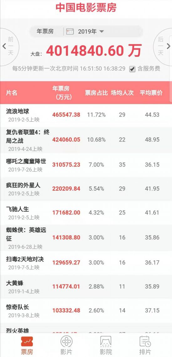 2019年中國(guó)電影票房已突破400億,據(jù)國(guó)家電影專資辦數(shù)據(jù),2019年中國(guó)電影票房在8月9日突破400億,比去年(8月5日)的票房節(jié)點(diǎn)晚4天。今年票房榜前三名《流浪地球》《復(fù)仇者聯(lián)盟:終局之戰(zhàn)》《哪吒之魔童降世》貢獻(xiàn)了總共110多億的票房收入,截至9日17時(shí),《哪吒之魔童降世》票房已突破31億。