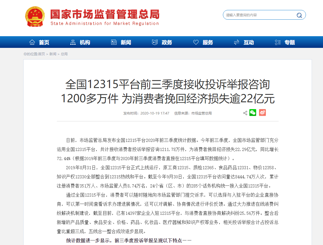 國家市場監(jiān)督管理總局介紹,今年前三季度,全國市場監(jiān)管部門充分運(yùn)用全國12315平臺,共計接收消費(fèi)者投訴舉報咨詢1211.78萬件,為消費(fèi)者挽回經(jīng)濟(jì)損失22.29億元,同比增長72.44%。(根據(jù)2019年前三季度與2020年前三季度消費(fèi)者直接在12315平臺填寫數(shù)據(jù)統(tǒng)計)