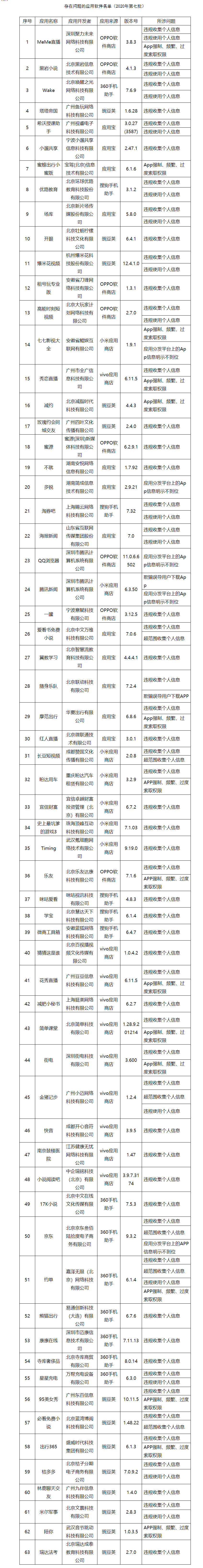 依據(jù)《網(wǎng)絡(luò)安全法》《電信條例》《電信和互聯(lián)網(wǎng)用戶個(gè)人信息保護(hù)規(guī)定》等法律法規(guī),按照《關(guān)于開展縱深推進(jìn)APP侵害用戶權(quán)益專項(xiàng)整治行動(dòng)的通知》(工信部信管〔2020〕164號(hào))工作部署,工信部近期組織第三方檢測機(jī)構(gòu)對(duì)手機(jī)應(yīng)用軟件進(jìn)行檢查,督促存在問題的企業(yè)進(jìn)行整改。截至目前,尚有63款A(yù)PP未完成整改!