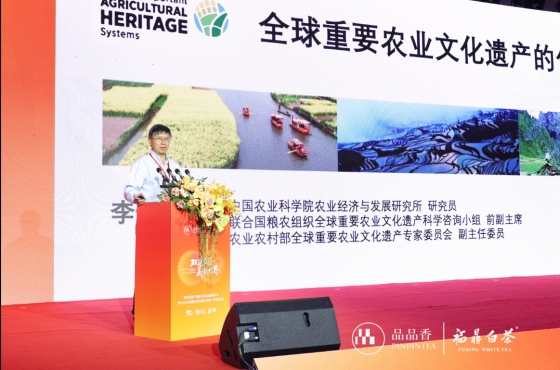 現(xiàn)場還延請兩位權威專家作專題分享。中國農科院農業(yè)經(jīng)濟與發(fā)展研究所研究員、聯(lián)合國糧農組織全球重要農業(yè)文化遺產(chǎn)科學咨詢小組前副主席李先德以《全球重要農業(yè)文化遺產(chǎn)的傳承和發(fā)展》為題,結合全球農遺標準與福鼎實踐,指出“福建福鼎白茶文化系統(tǒng)”的核心特征——提供食物營養(yǎng)與生計安全保障、擁有豐富的農業(yè)生物多樣性、當?shù)貍鹘y(tǒng)知識與技術體系、極具地方特色的茶文化、多樣迷人的茶園景觀。同時提出保護端需守護茶樹種質、傳統(tǒng)技藝與習俗;發(fā)展端要打造高端特色產(chǎn)品、探索茶文旅融合,并構建“政府-企業(yè)-合作社-茶農”多方利益共享機制,保障福鼎白茶可持續(xù)發(fā)展。