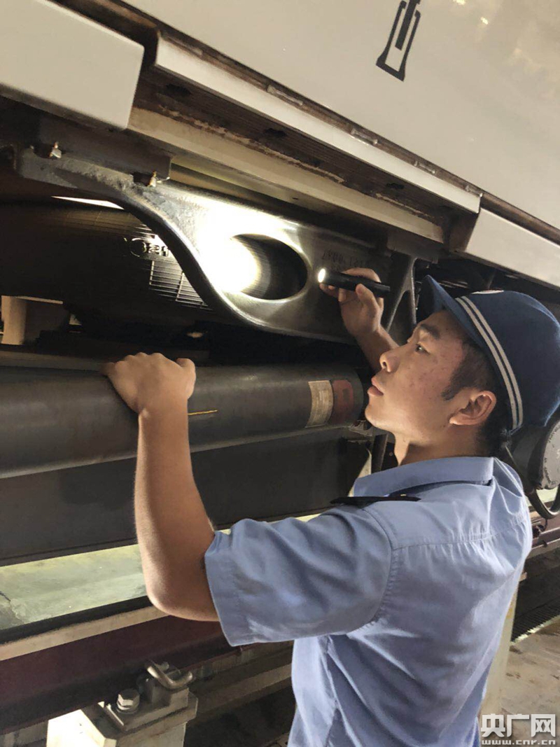 地勤機械師在動車組側(cè)邊檢查空氣彈簧狀態(tài)(央廣網(wǎng)發(fā) 通訊員孫文龍 攝)