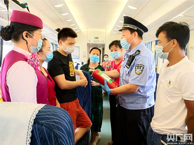 乘警長張邵軍給隨行家長和年紀比較大的孩子講列車消防知識(央廣網發(fā) 通訊員供圖)