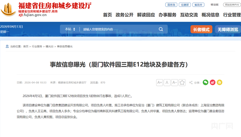 央廣網(wǎng)福州4月13日消息(記者龔雯)近日,福建省住房和城鄉(xiāng)建設(shè)廳發(fā)布一則事故信息曝光:2026年4月5日,廈門軟件園三期E12地塊項(xiàng)目發(fā)生1起物體打擊事故,造成1人死亡。