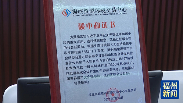 7月23日,第44屆世界遺產(chǎn)大會(huì)碳中和啟動(dòng)儀式在福州海峽國(guó)際會(huì)展中心舉行,F(xiàn)場(chǎng),世遺大會(huì)福州市籌備辦與泰寧縣杉陽山區(qū)綜合開發(fā)有限責(zé)任公司簽訂第44屆世界遺產(chǎn)大會(huì)碳中和協(xié)議,并由海峽資源環(huán)境交易中心向世遺大會(huì)福州市籌備辦頒發(fā)碳中和證書。