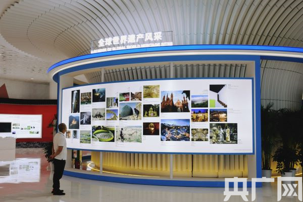 圖為“全球世界遺產(chǎn)風(fēng)采”展區(qū),以環(huán)繞式布局展現(xiàn)89項(xiàng)世界遺產(chǎn)(央廣網(wǎng)發(fā) 龔雯攝)