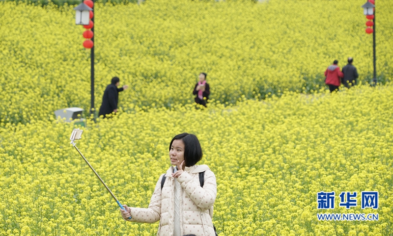 2月2日,游人在福州花海公園盛開的油菜花前拍照。新華社記者 宋為偉 攝